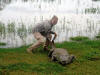 | Sobald der Regen aufgehört hat fahren wir los - zunächst zu einer Krokodilfarm. Wir gehen davon aus, dass die friedlich grasenden Rinder direkt neben den faul auf der Wiese liegenden Krokodilen ein Zeichen dafür sind, dass diese satt sind. Die Farmbetreiber sind sehr aufmerksam, sagen uns genau, wo wir entlang gehen dürfen und wenn wir einem dieser Urzeitmonster der Rücken zukehren, ist immer jemand da, der es im Auge behält. Für das größte kaufen wir ein lebendes Hühnchen als Opfer. Dafür lässt es sich brav mit uns fotografieren. Irgendwie bin ich froh, dass wir das heil überstanden haben. |