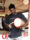 | Zuerst erstehen wir dann doch zwei Talking-Drums, die Abdallah für uns ausprobiert (eine davon bekommt natürlich die Gaia-Percussion) und zwei Gonkoguis. Dabei beweisen wir äußerstes Verhandlungsgeschick. Wo wir den Preis der Trommeln nur von 60 auf 50 Cedi drücken können, gelingt uns bei den Glocken DER Clou: Anstatt der zunächst verlangten 150 Cedi bekommen wir sie für ganze 50. Leider finden wir keine geeigneten Taschen für die Trommeln. Eine würde uns gefallen, die hat aber ein Loch. Der Verkäufer will uns weis machen, dass läge daran, dass sie in Handarbeit hergestellt sei. Damit bin ich aber nicht einverstanden. Nachdem ich ihm erkläre, dass meine Handarbeiten perfekt sind, ist er sauer und spricht nicht mehr mit uns. |