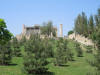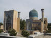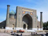 | Auf dem Weg zurück ins Zentrum schauen wir uns als nächstes die Bibi-Khanum-Moschee an, die der legendäre Herrscher Amir Timur der Mutter seiner Lieblingsfrau widmete. Die auffälligste Besonderheit sind die vier Minarette, die das relativ große Gelände begrenzen. Leider gibt es für mich keine Möglichkeit, alles zusammen auf ein Foto zu kriegen. Den von Ulug Beg gestifteten riesigen steinernen Koranständer, der im Mittelpunkt steht, erkenne ich nur als solchen, weil er auf den Reiseführerbildern zu sehen war. |
