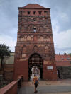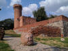 | Auf der Fahrt nach Norden führt uns ein braunes Kulturschild zur Wasserburg nach Swiecie. Für 5 Zloty (1,10€) pro Person können wir uns die gut gesicherte Ruine ansehen. Aufnahmen von alten Postkarten zeigen, wie alles ausgesehen hat, als das Örtchen noch Schwetz hieß. Wir klettern eine endlos scheinende enge Wendeltreppe auf den Turm hinauf, was bei 35°C nicht die beste Idee ist. Für den herrlichen Rundumblick hat es sich aber gelohnt. |