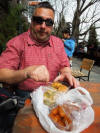 | Es zieht uns wieder ans Wasser - wir wandern zum Fischmarkt, wollen hier aber eigentlich gar nichts, sind ziemlich unentschlossen und fahren mit der S-Bahn zurück in die Altstadt. Hier bummeln wir also wieder über den Basar, suchen Gassen, die wir noch nicht kennen, finden diese natürlich auch und kommen an einem kleinen Naschkatzen-Laden vorbei - das heißt, wir kommen eben NICHT an ihm vorbei. Ich möchte einen Schokopudding, Andreas findet die herzhafte Ecke und nimmt lieber einen Nudelauflauf. Ich möchte noch einen Schoko-Quarkkuchen und der ist soooo lecker, mit einem russischen Zupfkuchen nur entfernt zu vergleichen schlägt er alle meine bisherigen Quarkkuchenerfahrungen. Der nette Ladenopi lässt Andreas, während ich schlemme, noch von einigen anderen Leckereien kosten. Für ihn ist das aber nicht so toll; er gönnt sich unterwegs lieber ein Muschelsandwich. Das schmeckt ihm besser. | |