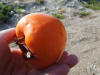 | Straßenverkäufer bieten Äpfel und orange Früchte an, von denen wir eine zum Probieren kaufen. Den russischen Namen kennen wir nicht, aber sie sieht fast wie eine große Kaki aus (das wird später auch von Mama und Wikipedia bestätigt). Wir schälen und essen sie gleich - sicher ist sie sehr gesund - so schmeckt sie jedenfalls. Nochmal kaufen wir keine. |