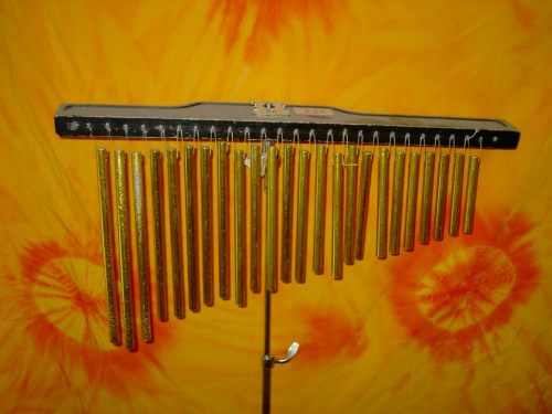 Die Bar-Chimes bestehen aus goldfarbigen Aluminiumstäben, die an feinen Plastikschlaufen an einer Holzschiene aufgehängt sind. Sie erzeugen klirrende, klingelnde, atmosphärische Klanggeräusche. |