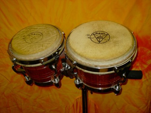 Die Bongo ist ein typisch kubanisches Instrument. Sie besteht aus zwei kleinen Trommeln mit unterschiedlicher Kesselgröße. Die kleinere und höher gestimmte heißt Macho (Mann), die größere, tiefer gestimmte trägt den Namen Hembra (Frau). Bongos werden zwischen den Knien oder auf einem speziellen Ständer mit den Fingern oder dünnen Stöcken gespielt. Als Soloinstrument sind sie in unseren Stücken "Liberte" und "Le Serprent" zu hören. |