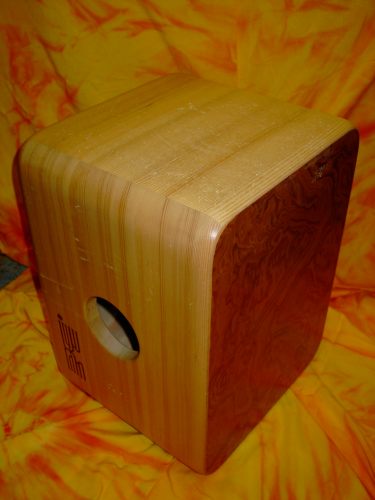 Das Cajon [Kachon] ist in Lateinamerika beheimatet. Als die Sklaven gezwungen wurden, ihre Trommeln zu verbrennen, dienten als Ersatz einfache Holzkisten. So entstand dieses Instrument, auf das alle Schläge der Conga-Technik problemlos übertragen werden können. Bei einem neueren Modell sind im Inneren kleine Messingglöckchen an quer verlaufenden Gitarrensaiten eingespannt. |