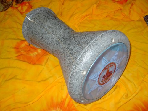 Die Darabouka ist im arabischen Kulturraum zu Hause. Das Plastikfell benötigt eine hohe Spannung, damit ihr charakteristischer Klang zum Tragen kommt. Die große Klangvielfalt, ausgelöst durch die verschiedenen Fingertechniken, verleiht ihr einen magischen Trommelklang, der in unserem Stück "Pschah" besonders eindrucksvoll zu hören ist. |