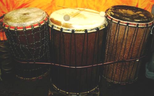 Die drei wichtigsten Basstrommeln, die in afrikanischen Rhythmen als Begleitinstrumente gespielt werden, heißen Djun (die größte), Sangba (die mittlere) und Kenkeni (die kleine Trommel). Ihre tragende Funktion ist besonders in den Stücken "Aruande" und "Symbol Che" zu erkennen. |