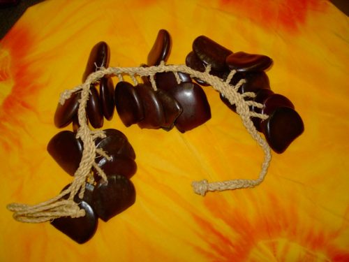 Die afrikanische Rasselkette besteht aus halboffenen Hartfruchtkernen, Palmkernen oder Nüssen, die auf ein geflochtenes Bastseil geschnürt sind. Ihr lautes Rauschen muss sehr sparsam eingesetzt werden, um störende Wirkungen zu vermeiden. |