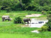 | In der Ferne beobachten wir, wie sich die Elefanten in einem Wasserloch baden. Zum Glück haben unsere Fotoapparate gute Zoom-Funktionen. Während wir später auf der großen Hotelterrasse sitzen, Postkarten nach Hause und das Tagebuch schreiben, tummeln sich einige andere europäische Touristinnen in und um den Pool. Im Hintergrund läuft heute über alle Fernseh- und Radiosender die Beisetzung des Präsidenten. |