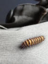 | 13.8.2012 Auf meiner Hose sitzt eine haarige Raupe. Und jetzt kommt uns eine Idee. Wir haben vorgestern bei unserem Gespräch mit Aballah kurzärmlig unter den Mangobäumen gesessen. Vielleicht sind uns ja Raupenhaare ähnlich denen des deutschen Eichenprozessionsspinners auf die Arme gefallen. Das würde diese schrecklichen juckenden Pusteln erklären. Weil wir aus Deutschland gewarnt sind, dass dies sogar lebensgefährlich werden kann, schlucken wir vorsichtshalber jeder eine Allergietablette. Jetzt dürfen wir weiter leben! |