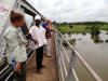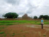 | Unterwegs halten wir in Wulugu. Dort steht ein Moschee, die ebenso alt ist wie die in Larabanga, aber in ganz anderem Stil gebaut wurde. Sie soll innen viele Gänge und Räume haben, die fast wie ein Labyrinth angeordnet und bis zum Dach und zu vielen verschiedenen Ausgängen führen, damit die Menschen sich in Sicherheit bringen konnten, wenn sie von Feinden angegriffen wurden. Leider können wir nicht hinein gehen, weil der anhaltende Regen das Baumaterial instabil gemacht hat. |