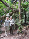 | Der Weg, dem wir folgen, heißt "Drei-Schwestern-Pfad". Er wurde benannt nach einem Baum, dem aus einer Wurzel drei Stämme entwachsen. Besonders interessant sind die vielen großartigen Bäume mit gewaltigen Wurzeln, in denen sich sogar die Tiere manchmal verstecken. Zu vielen Pflanzen erklärt er uns die medizinischen Anwendungsmöglichkeiten. Schade, dass es die bei uns zu Hause nicht gibt --> es reicht von Malariaprophylaxe und -behandlung über Viagraersatz (Wolfgang kriegt gleich ein großes Stück zum Mitnehmen), Mittel gegen Bluthochdruck, Diarrhöe, Verstopfung und für eine leichte Geburt. Die Früchte eines speziellen Baumes schmecken den Affen des Waldes so gut, dass sie es sich morgens und abends hier gut gehen lassen. Deshalb heißt der Cola-Affen-Baum. Auf dem Boden sind jede Menge Samen verstreut, aus denen schon mehrere Keimlinge sprießen. |