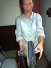 | Zuerst erstehen wir dann doch zwei Talking-Drums, die Abdallah für uns ausprobiert (eine davon bekommt natürlich die Gaia-Percussion) und zwei Gonkoguis. Dabei beweisen wir äußerstes Verhandlungsgeschick. Wo wir den Preis der Trommeln nur von 60 auf 50 Cedi drücken können, gelingt uns bei den Glocken DER Clou: Anstatt der zunächst verlangten 150 Cedi bekommen wir sie für ganze 50. Leider finden wir keine geeigneten Taschen für die Trommeln. Eine würde uns gefallen, die hat aber ein Loch. Der Verkäufer will uns weis machen, dass läge daran, dass sie in Handarbeit hergestellt sei. Damit bin ich aber nicht einverstanden. Nachdem ich ihm erkläre, dass meine Handarbeiten perfekt sind, ist er sauer und spricht nicht mehr mit uns. |